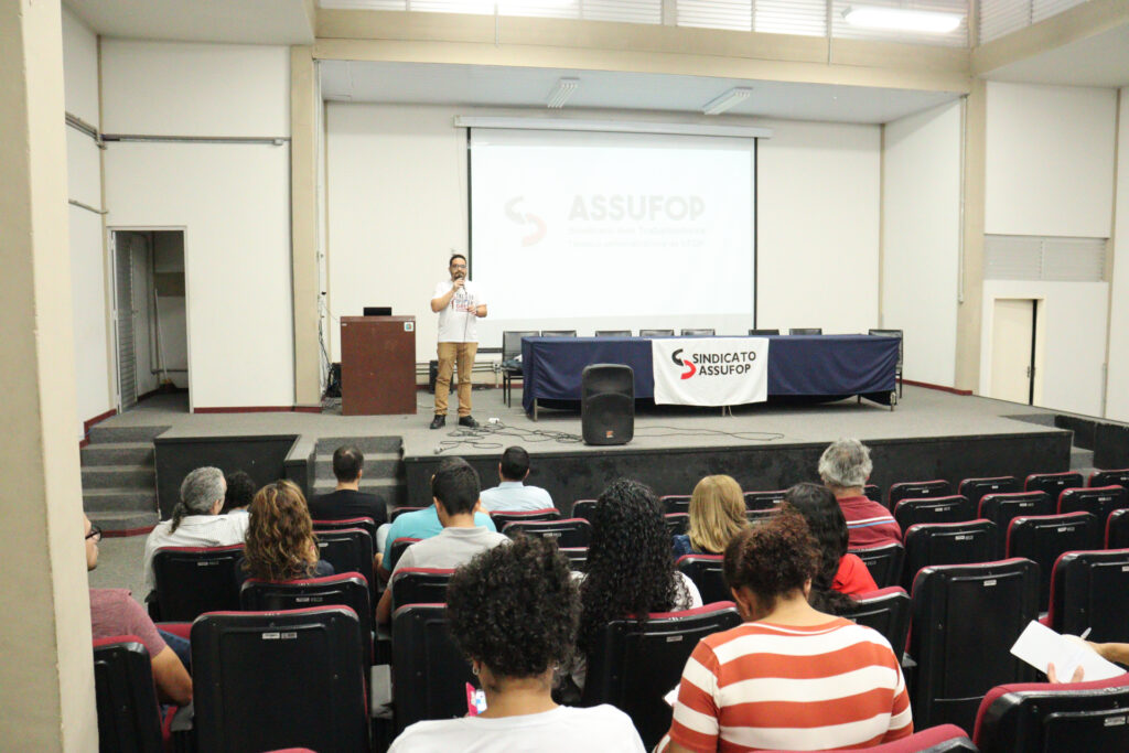 Gabriel Souza, presidente do sindicato, coordenou a assembleia e iniciou os trabalhos com uma apresentação detalhada sobre o tema. Em seguida, o Pró-reitor de Gestão de Pessoas da UFOP, Paulo Fernando Teixeira de Camargo, integrou a mesa para responder aos questionamentos dos associados.